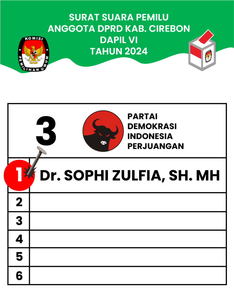 "Hormat saya kepada seluruh masyarakat Kabupaten Cirebon tercinta. Saya, Sophi Zulfia, dengan rendah hati ingin memperkenalkan diri sebagai kandidat anggota DPRD Kab. Cirebon Daerah Pemilihan VI (enam). Saya berkomitmen untuk mengadvokasi kebijakan-kebijakan yang mendukung hak-hak setiap warga. Saya percaya bahwa keadilan sosial adalah pondasi untuk kesejahteraan bersama. Mari bersama-sama menciptakan Kab. Cirebon yang berbasis pada nilai-nilai keadilan, perlindungan hak asasi manusia, dan pemberdayaan masyarakat. Pilih saya, dan mari kita jadikan Kabupaten kita lebih baik, lebih adil, dan lebih sejahtera untuk semua." Melalui pengalaman dan komitmen saya, saya siap menjadikan setiap suara rakyat sebagai kekuatan untuk menghadirkan solusi nyata bagi permasalahan yang dihadapi oleh masyarakat.